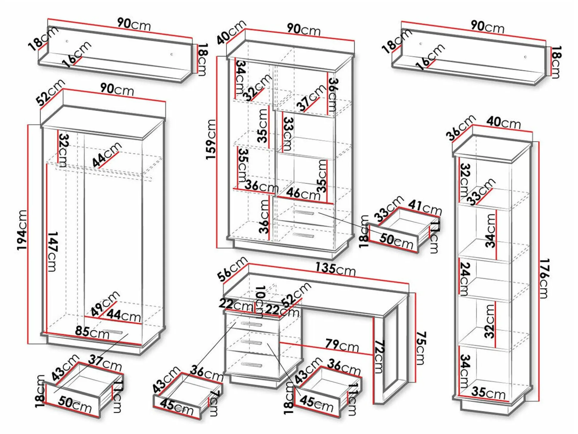 159 x 90 x 40; 176 x 40 x 36 cm