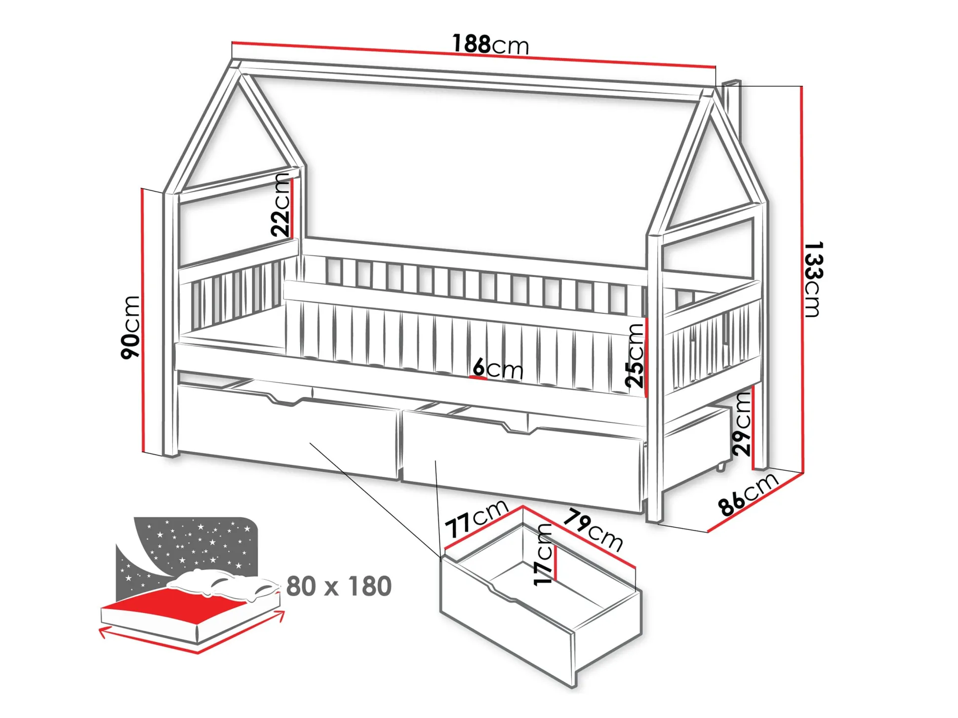 Tilpasset til madrassen 80 x 180 cm