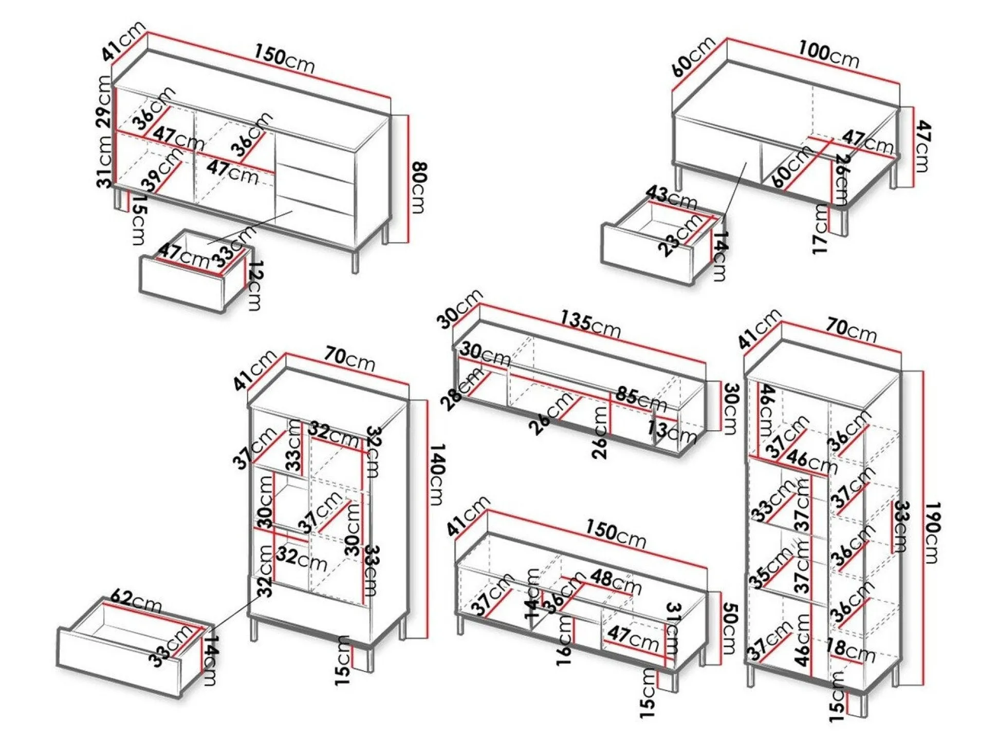 140 x 70 x 41; 190 x 70 x 41 cm