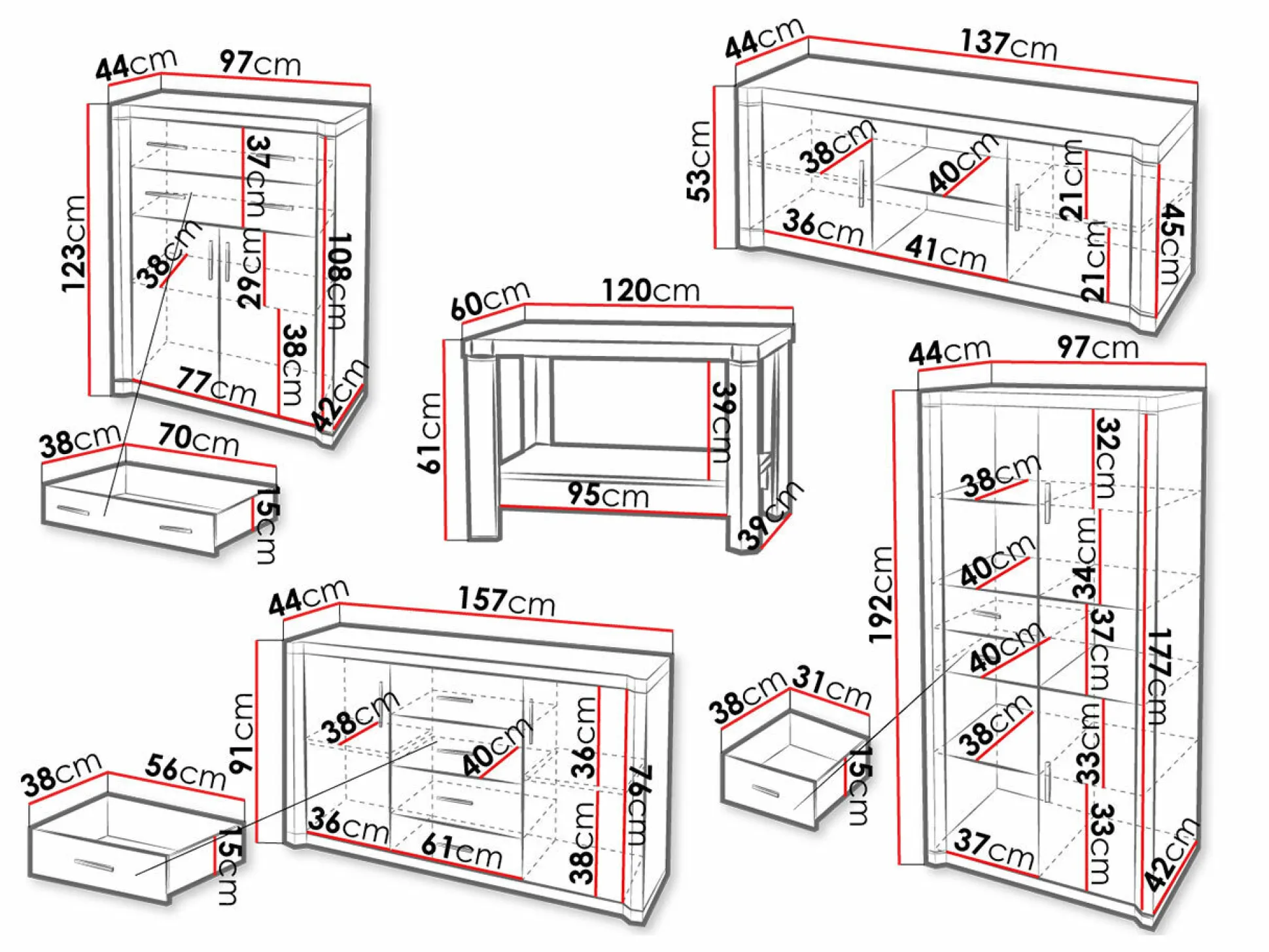 91 x 157 x 44; 123 x 97 x 44 cm