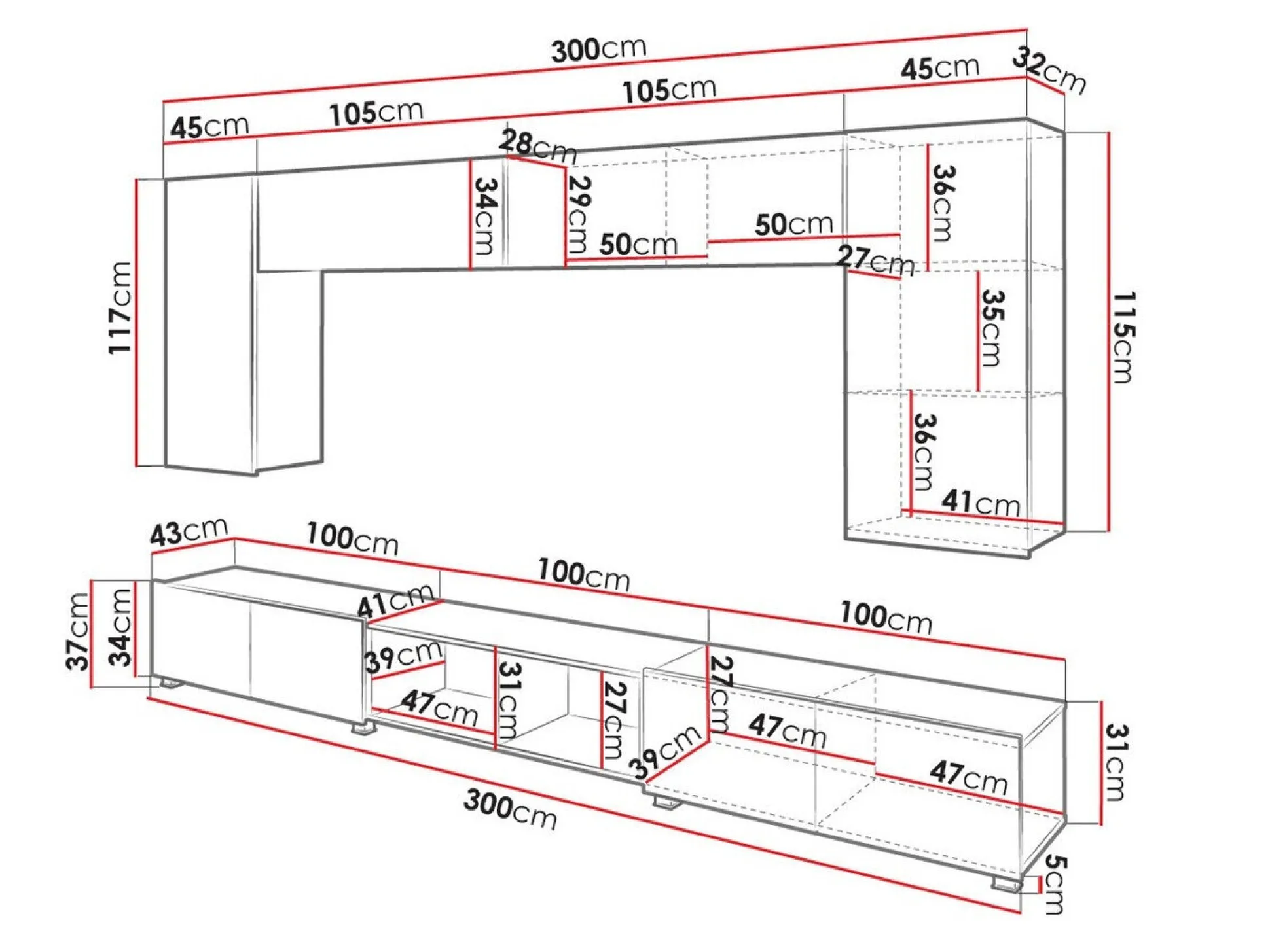 34 x 210 x 32; 117 x 45 x 32 cm