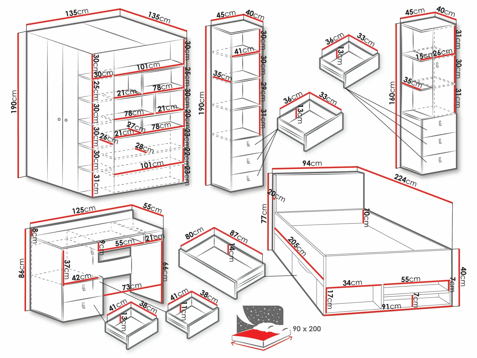 - 90 x 200 cm