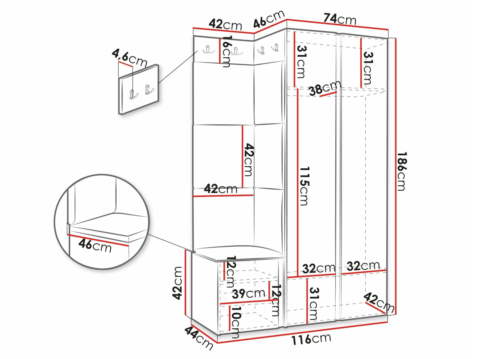 186 x 74 x 46 cm
