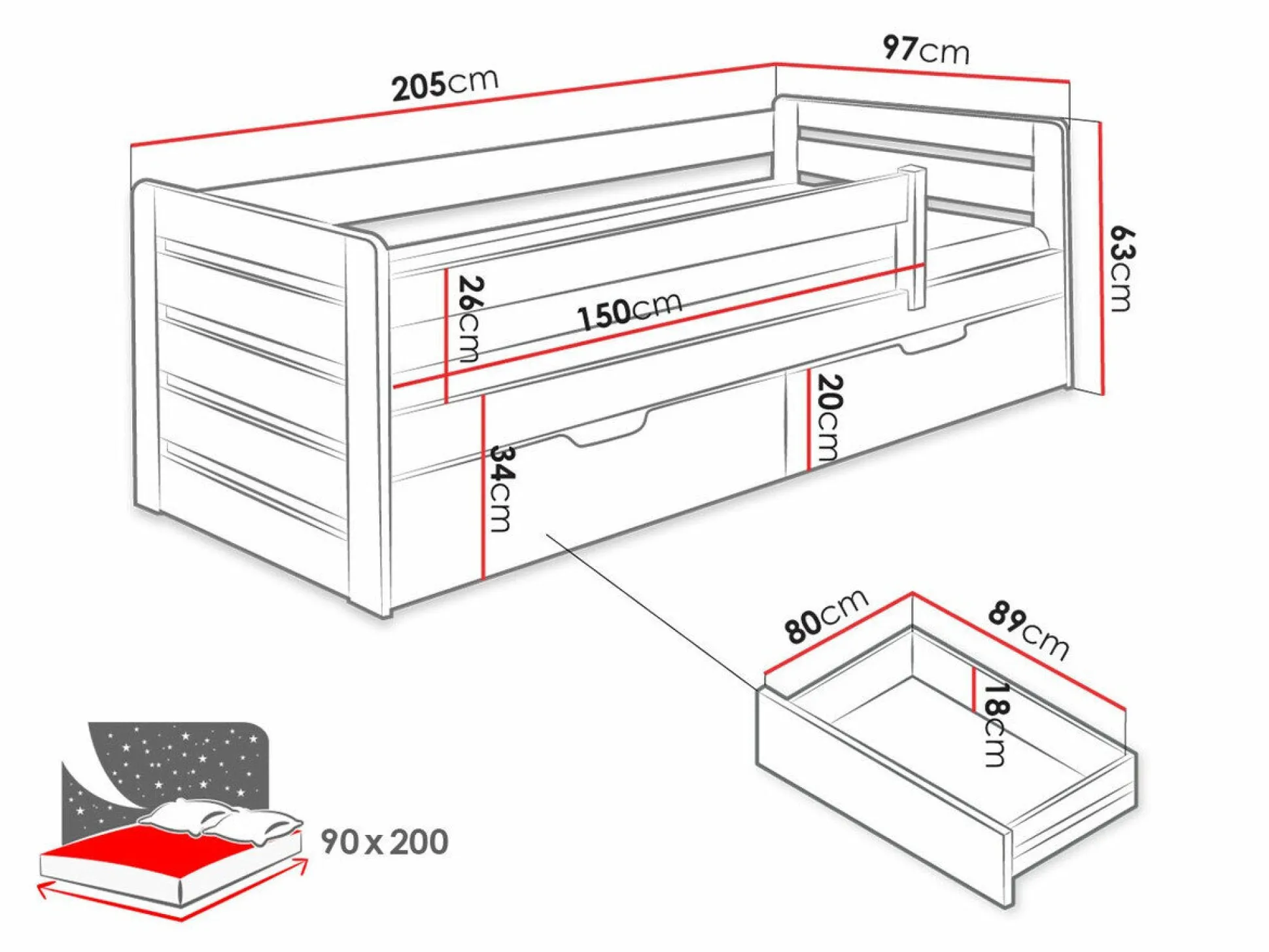 Tilpasset til madrassen 90 x 200 cm
