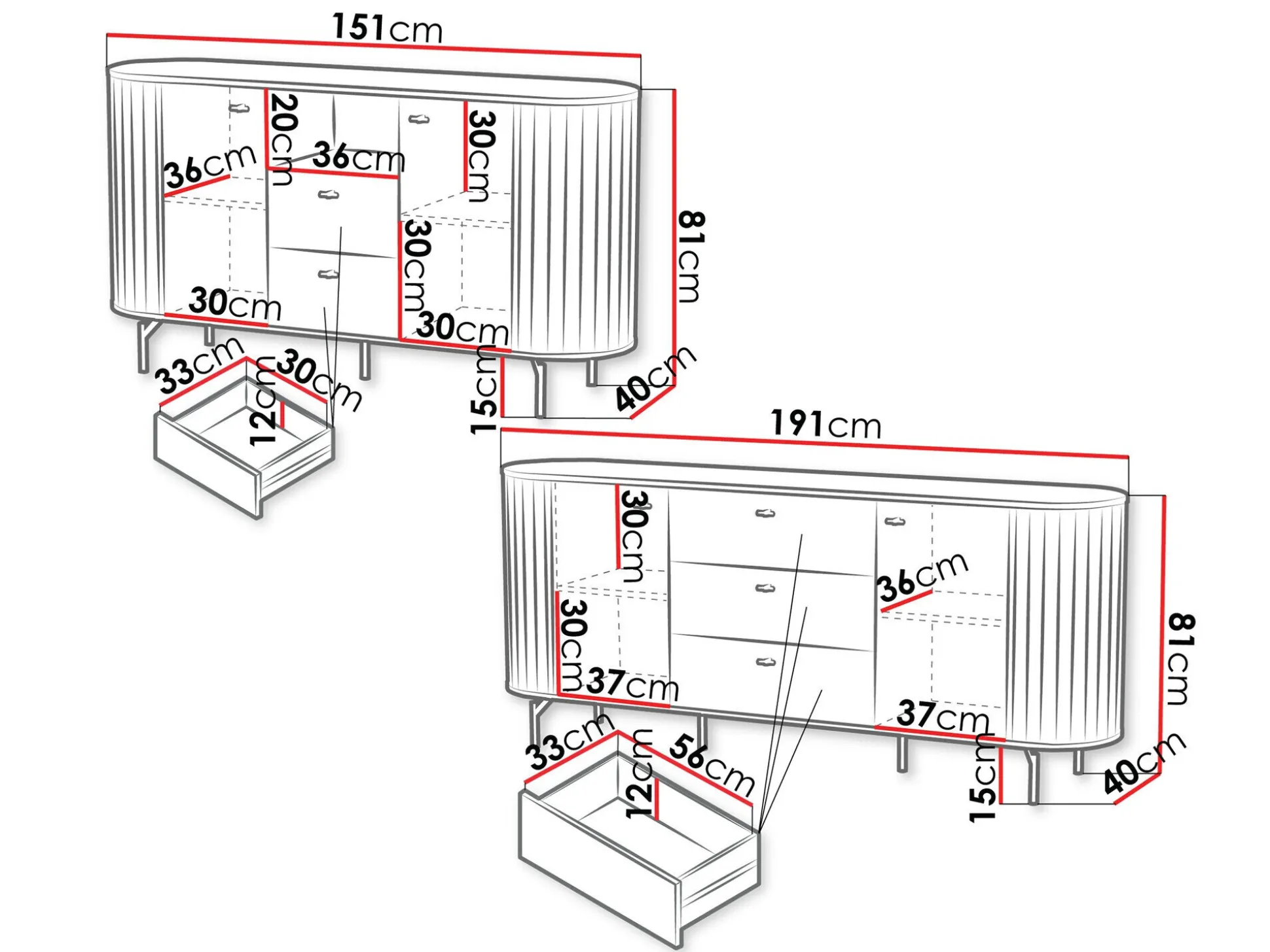 81 x 151 x 40; 81 x 191 x 40 cm
